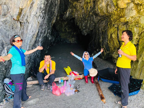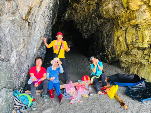 領隊勇闖向下試探先行,讓大小姐們安心不少,一路用繩岌岌可危的平安到烏岩角下的神秘山洞花了三個小時