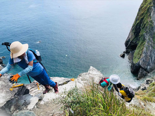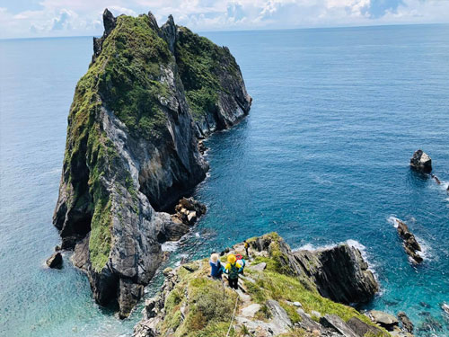 登山高手威廉淑惠夫妻🎎策劃五人同行,早上8:00不猶豫加入行列走一趟吊掛之旅,10.8路邊柵欄圍著太高,開始找不到登山口但又看到路標條,領隊帶頭爬過障礙,一路粉層山坡連續垂降震撼心碎💔快一個小時,才有機會平坦地方休息喝水,眺望烏岩角座落大遍海域之美唯我獨享,神造萬物最後留一手艱難任務,崕石到沙灘幾乎85度挨邊垂降,看著手腳抖抖抖不想下去